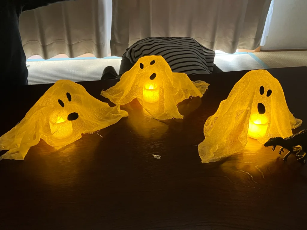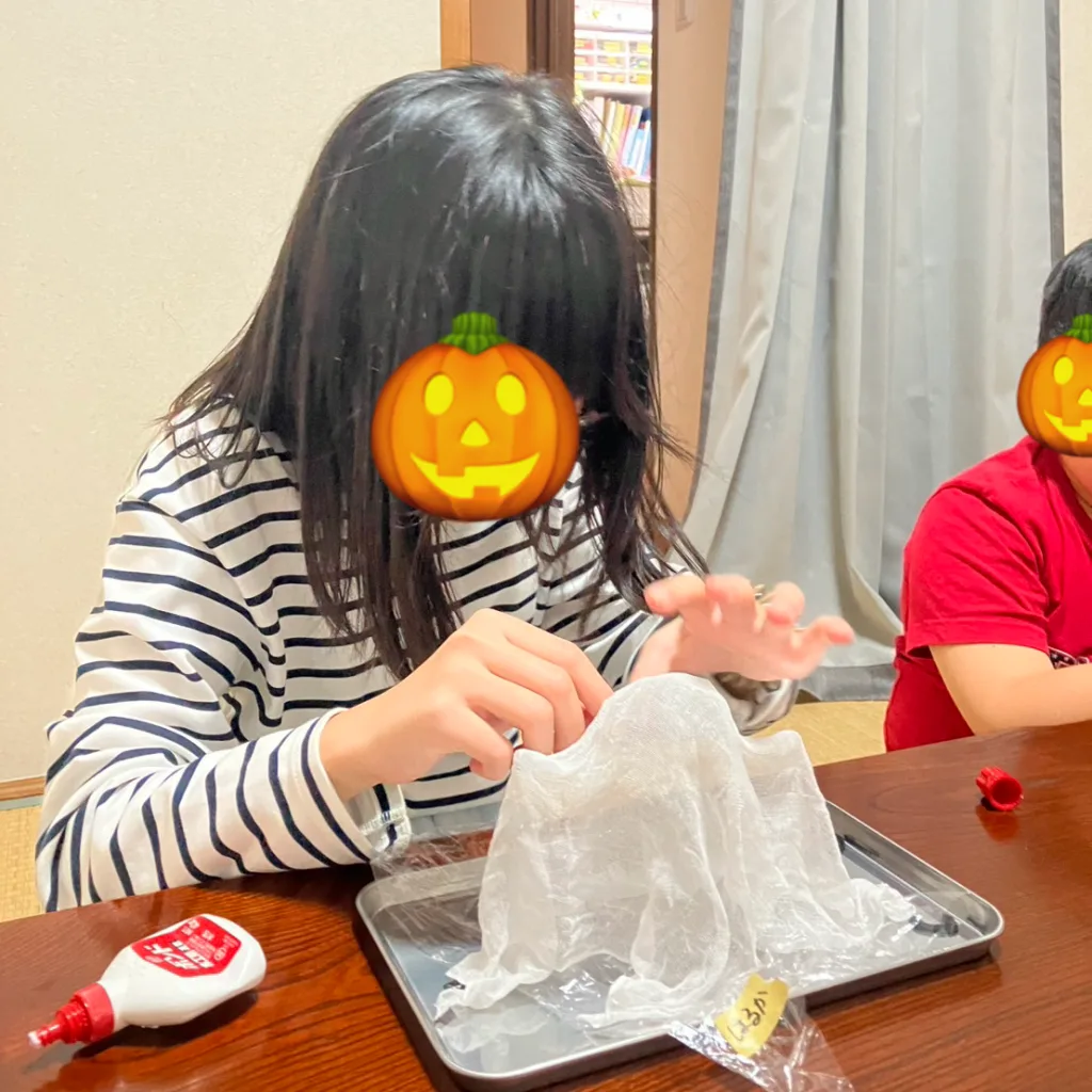 薄いガーゼを糊で固めてオバケの形にしていきます👻