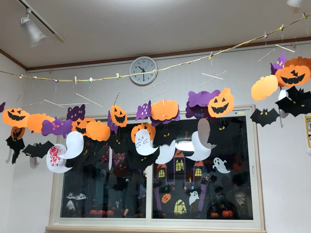 1くみのみんなは、オバケ👻とコウモリ🦇とジャックオーランタン🎃とキャンディ🍬のモビールを作りました♪